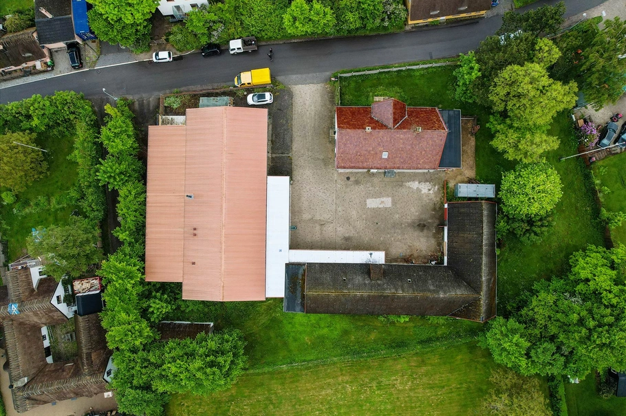 Erhvervsbygningerne på i alt 1.264 m². er indrettet med lager- og produktionslokaler på ca. 700 m² fordelt på to etager og en tidligere staldbygning på ca. 600 m² med høloft samt værksted og en garage. Stueetagen på ca. 510 m² og indrettet med garageport i facaden vendende ind mod gården, 2 store lagerrum på ca. 300 m² og med ca. 3 meters loftshøjde. Langs den nordlige facade er der indrettet storrumskontor med dobbeltdør ud til udvendig terrasse, ældre badeværelse, flere kontorer og mødelokaler samt stort køkken/kantine med ældre køkken og fordelingsgang med adgang til 4 nyrenoverede badeværelser med hvide vægfliser og grå gulvklinker.