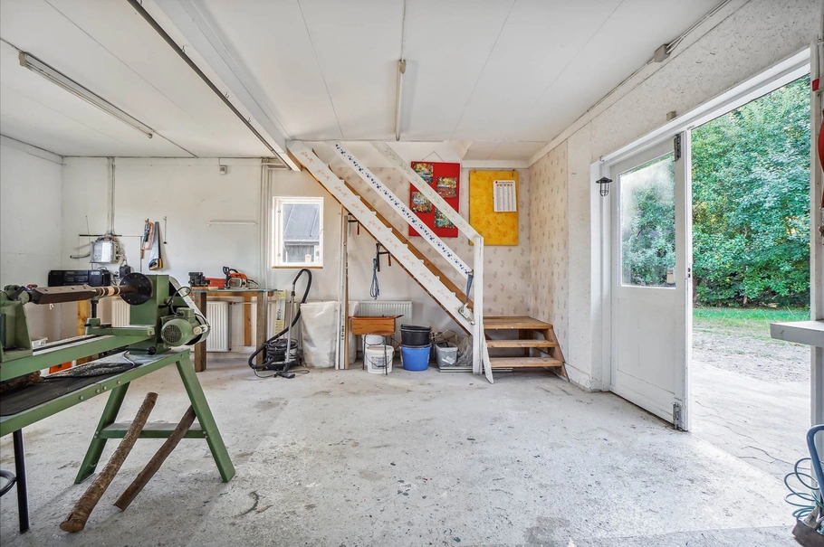 Ved siden af værkstedet ligger en tilhørende garage med 3 gode porte. Denne garage kan ud over garage sagens bruges til ekstra lager og har også et loft.