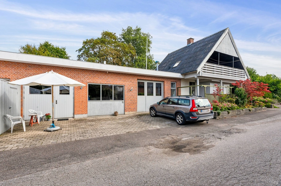 Boligen råder ligeledes over to etager med en helt ideel planløsning. Der er to gode værelser og et badeværelse med kar på 1. sal, og så forlænges etagen af en skøn, vestvendt altan. Leverummene er at finde nede i stueetagen, hvor et stort køkken og en stue placerer sig, og fra sidstnævnte kan du skyde døren til side og træde direkte ud på terrassefliserne. Alt i alt kan du flytte ind i nogle rigtig gode rammer med pæne faciliteter og masser af muligheder for at præge og modernisere - på sigt kan du endda muligvis opnå tilladelse til at inddrage nogle af erhvervsarealerne til boligen.