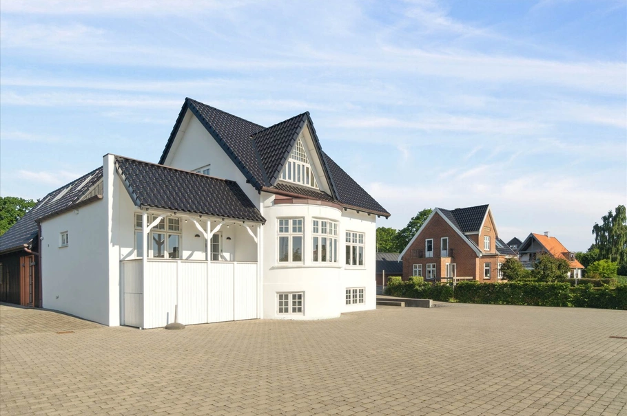 Det oprindelige stuehus er opført i 1915 og sidenhen til- og ombygget i 1973. Det fremstår herskabeligt med sort glaserede teglsten, smuk karnap, dannebrogsvinduer samt kobber tagrender og inddækninger. Denne bygning andrager ca. 300-320 m². Fælles for det hele er at samtlige kvadratmeter er nydeligt opdaterede i kvalitetsmaterialer og i et moderne udtryk.