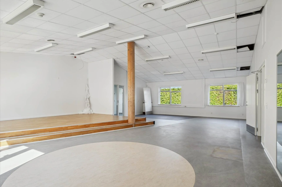 Bygningen er opført i flotte gule mursten, taget med nyt tagpap, tagrender og nedløb i sortmalet metal. Vinduer er termo i hvide trærammer. Indvendigt er lofterne monteret med akustikplader, gulve er belagt med linoleum, klinker og parketstave, vægge er malet i hvid farve. Indretningen er en blanding af store og mindre rum, flere køkkener, toiletter og badefaciliteter. Grundet tidligere anvendelse er en der toiletfaciliteter til små børn og bygningen vil i sin nuværende form være oplagt til en daginstitution. Der kan dog ved overskuelige bygningsændringer skabes base for en lang række andre virksomhedstyper. Se indretningsplan andet sted i prospektet.