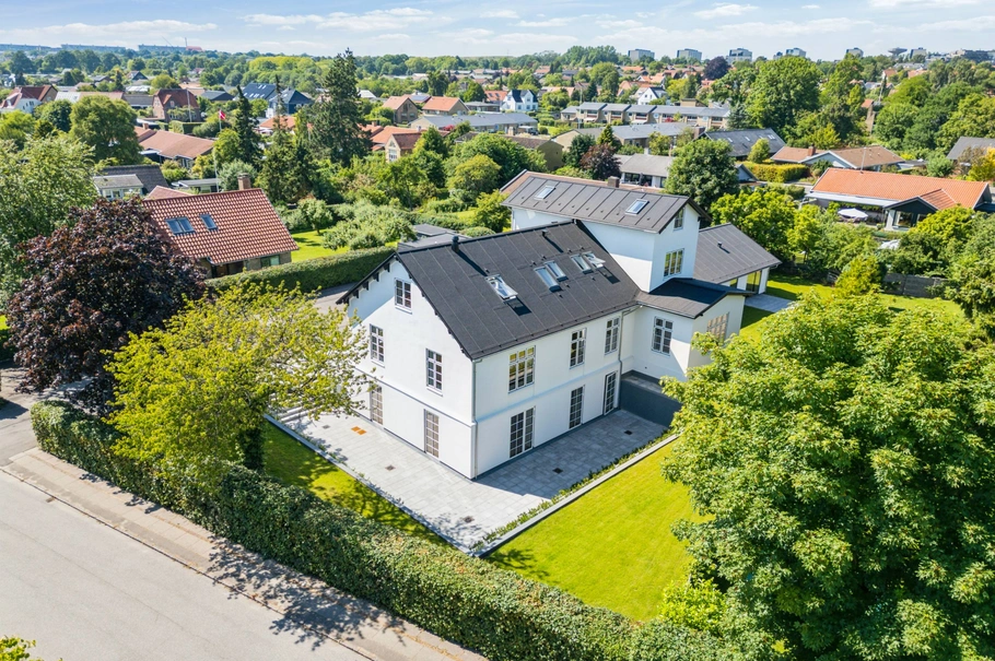 virksomhed. Den fantastisk flotte, hvidskurede patriciervilla er indrettet i flere plan. Det er massive XL sildebens parket gulve, der pryder gulvene mellem de skarpe, spartlede og hvidmalede vægflader, der over alt brydes af de imponerende og flotte vinduespartier.
