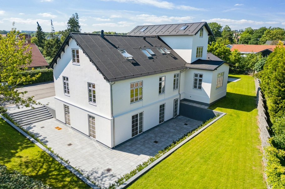 Udvendigt er ejendommen forsynet med eksklusiv facade belysning, der understreger de mange smukke bygnings detaljer, vindues- og dørpartier. Det store og særdeles indbydende terrassemiljø er elegant og naturligt indpasset i baghaven og kan entreres direkte fra kontorerne i stueniveau.