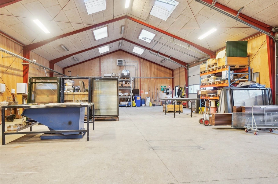 Lagerhallen er opført i sorte stålprofilplader og har sadeltag pålagt fibercementplader. Hallen består af et opvarmet og isoleret afsnit på ca. 300 m² og et uisoleret og uopvarmet afsnit på ca. 98 m². Der er intern portadgang imellem de 2 afsnit. Der er en god loftshøjde i hallen med hele 6 meter i kip og 4 meter i siderne. Der er tale om regulære og søjlefrie arealer med et godt lysindfald fra de mange ovenlysvinduer. Gulvet i den opvarmede del er betongulv, mens gulvet i den kolde del af hallen er belagt med belægningssten. Adgangen til lagerhallen sker via 3 store aluhejseporte i niveau med udvendigt terræn med målene 3,5 x 3,8 meter (h x b). Hallen er desuden forsynet med udsugning, og der er indlagt 35 AMP.