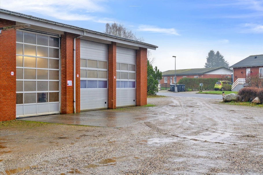 Ejendommen er en rødstensejendom med et ældre bølgeeternittag, og 4 store alu-porte.