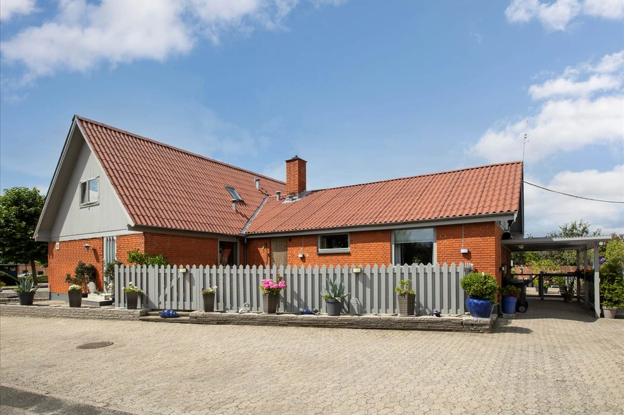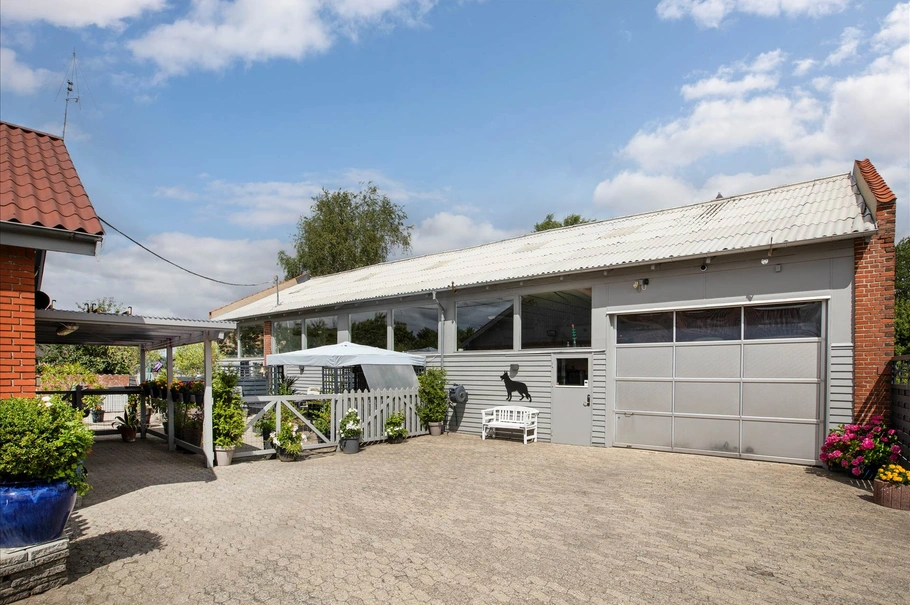 Her er muligheden for at erhverve en blandet ejendom med en 230 m² fin hal/garage som er godkendt til erhverv. Bygningen bruges i dag til garage og værksted, hvor der er stor el-port, smøregrav og isoleret værksted. Her kan laves et autoværksted, værksted til håndværkeren, lager til webshoppen, eller blot til bilentusiasten, hvor der god plads til mange biler og mulighed for lift.