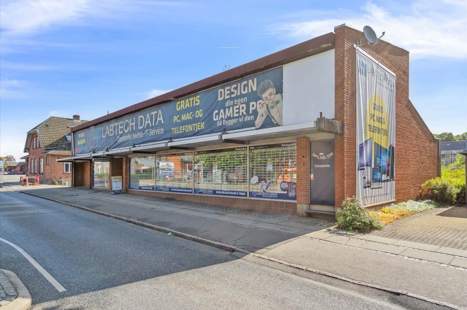 • Stor og langstrakt facade ud mod Banegårdsgade og lige overfor det nye Rema1000