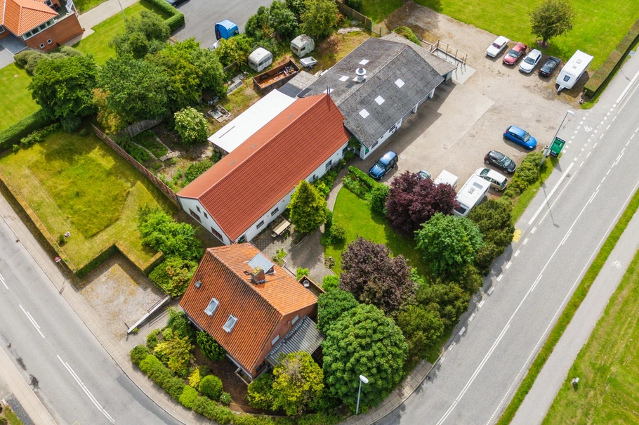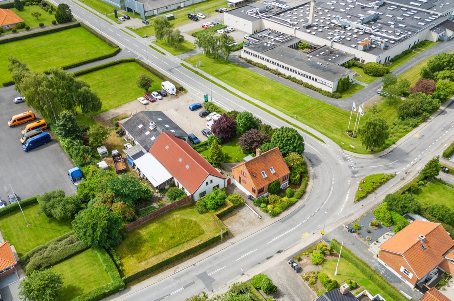 Blandet bolig- og erhvervsejendom med en erhvervsbygning p.t. udlejet til autoværkstedet Dronningborg Auto, samt en fritliggende villa, hvor ejeren selv bor indtil ejendommen sælges.