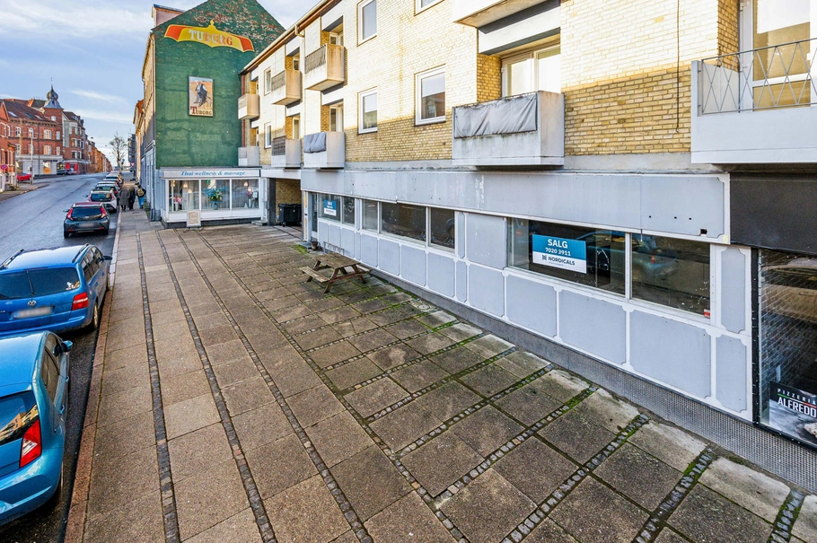 Ejerlejligheden er beliggende i stuen, og har synlig og bred facade med gennemgående vinduesbånd mod Markedsgade.