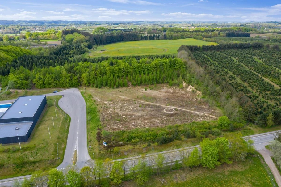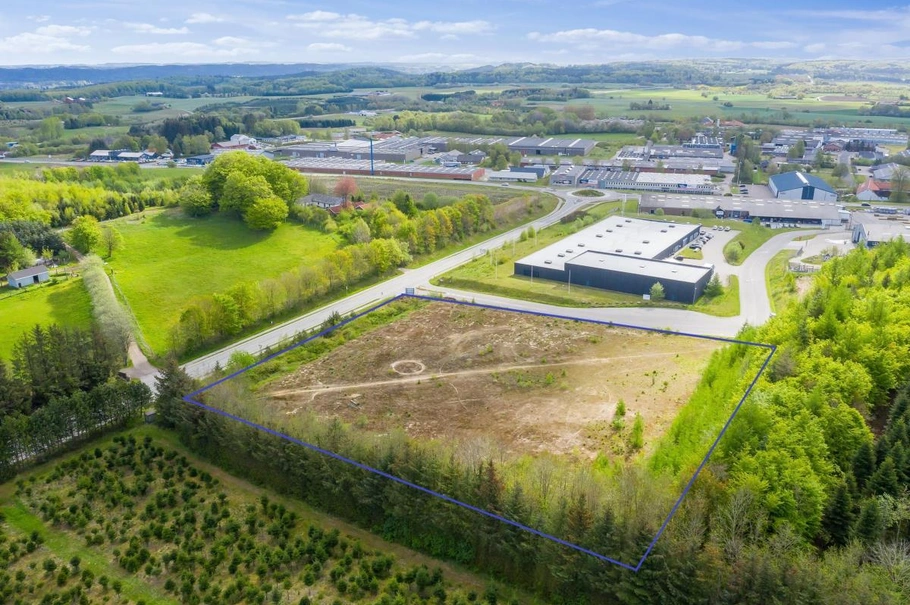 Udenomsarealer: Erhvervsgrunden ligger med en regulær næsten kvadratisk form med en bred asfalteret adgangsvej og med en ekstra bred vendeplads lige ud for adgangsvejen til selve grunden. På den ene grundside er et tæt bælte af nåletræer og i fjerneste hjørne i forhold til indkørslen grænser grunden op til en skråning op mod de bagvedliggende marker og plantager.