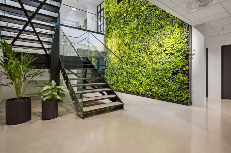 Alt, fra du parkerer i kælderen til elevatoren har bragt dig til orangeriet på tagterrassen, er gennemført og centreret omkring et åbent trappetårn med ovenlys og en fire etagers høj levende plantevæg med indbygget vandingssystem, som tilføjer friskhed og og farve. I det hele taget er der tænkt på klima og miljø, både udendørs med solceller og el-ladestandere, og indendørs med fokus på arbejdsklima og miljø.