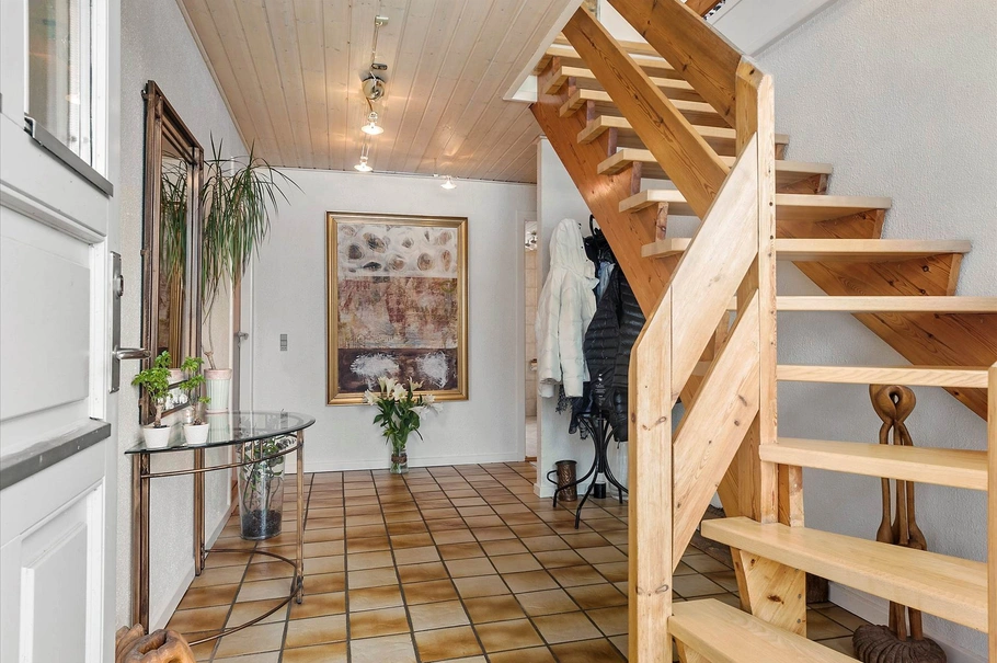 Boligen fremstår i pæn velholdt stand både ude som inde. Boligen er indrettet med pæn entre med klinkegulv og trappe til 1. salen. Fra entreen er der adgang til stueplanens øvrige rum. Stor vinkelstue med plads til både spisebord samt sofaarrangement. Pænt renoveret badeværelse med lyse klinker samt bruseniche. Kontor/værelse. Dejligt køkken med alt i hvidevarer og hyggelig spisekrog. Fra køkken adgang til bryggerset, hvorfra man kan gå ud til carporten samt til erhvervsdelen. 1. salen er indrettet med hyggelig opholdsstue med brændeovn. 3 store værelser, alle med indbyggede skabe. Stort badeværelse med brus.