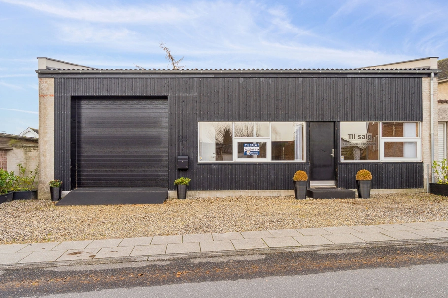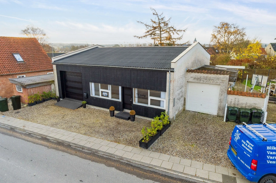 Midt i Hornslet udbydes denne gennemrenoverede og yderst anvendelige erhvervsejendom, som rummer et væld af muligheder for den rette køber. Ejendommen omfatter i alt 175 m², fordelt på et stort og åbent lokale, velegnet til kontor, showroom eller lignende, et pænt toilet/bad, nyt køkken, to separate kontorer samt en gennemgående garage med 3x3 m porte i begge ender. Garageområdet giver direkte adgang til en lille, aflukket og privat have.