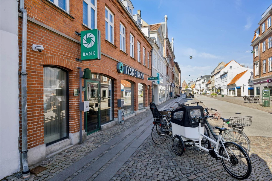 Ejendommen er opført i klassiske røde mursten med fibercementtag og er beliggende på en 592 m² stor grund med yderst velbeliggende parkeringspladser i baggården. Her findes et samlet etageareal på 586 m² jf. BBR. Ejendommen/lejemålet anvendes i dag af Jyske Bank og er registeret med 375 m² detail i stueplan samt henholdsvis 128 m² på 1. sal og 96 m² på øverste etage, hvor der i dag er kantine.