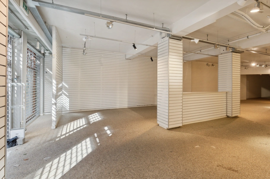 Butikslokalet har en flot facade med store vinduer og en dobbelt glasdør, der giver masser af naturligt lys og gør det nemt at tiltrække kunder. Der er niveaufri adgang til butikslokalet, hvilket gør det tilgængeligt for alle.