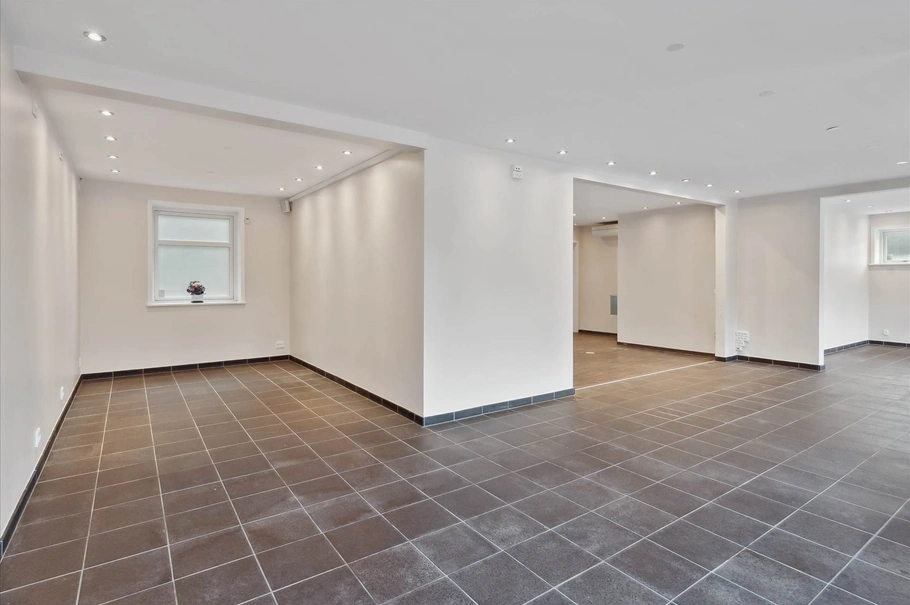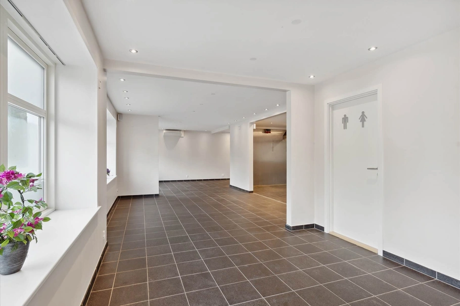 Der har tidligere været smørrebrødsbutik og pizzeria i stueplan, og der er klargjort til der kan være restauration igen i stueplan. Der er 2 toiletter i stueplan, dertilhørende stor garage med elektrisk port. Lejligheden på 1 salen afspejler en lejlighed man selv ønsker at bo i, som igen er opført med dyrt køkken, badekar og flotte gulve. Lejemål i stueplan og 1. salen er idag ledigt, og kan overtages hurtigt.