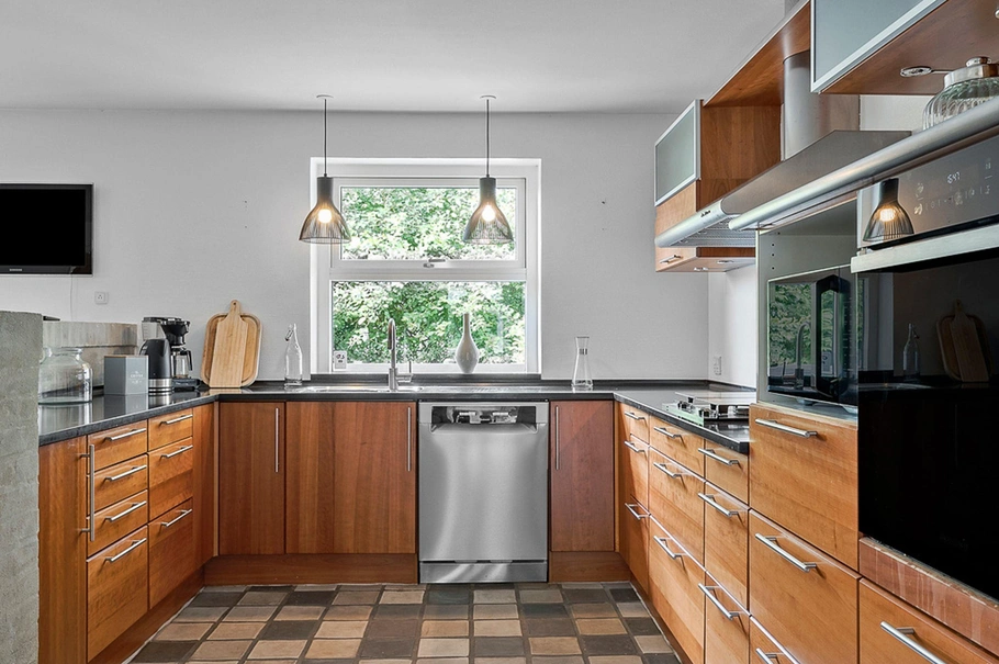 Entrè/hall med stort lysindfald, klinkegulv og med trappe til 1. sal. Stort rum på 29 m², godkendt til erhverv (tidligere 2 værelser), stort køkken/alrum med udgang til stor terrasse, stort toilet med plads til brus. Baggang med klinkegulv.