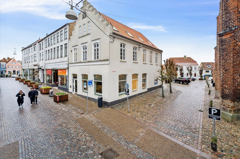Nørregade 1 er en unikt beliggende ejendom i hjertet af Haderslev, lige ved siden af Domkirken og tæt på byens populære torv med restauranter og