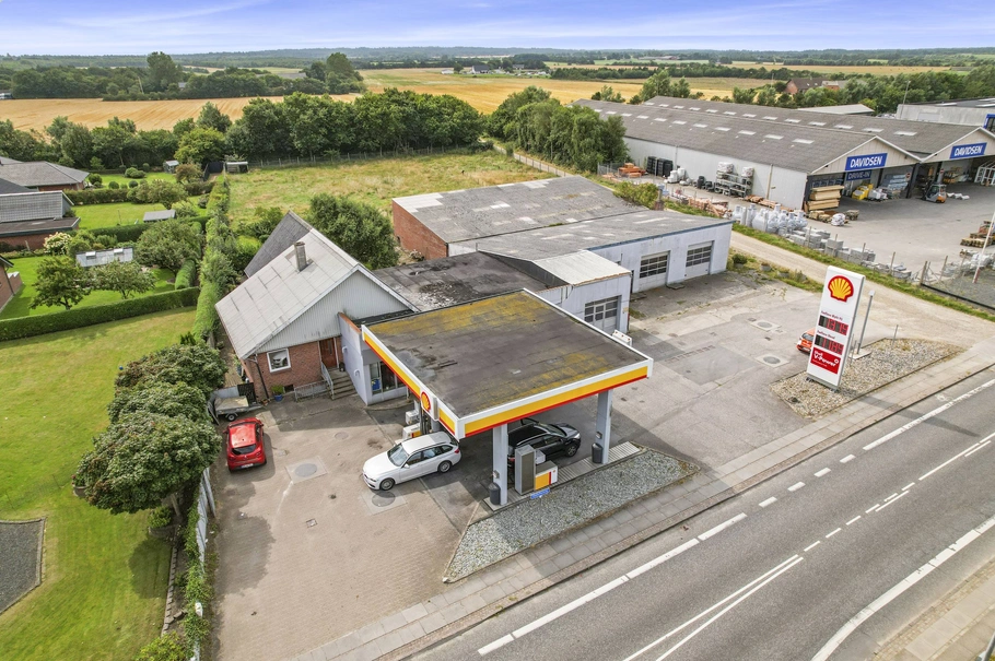 Ejendommen/tankstationen ligger på hovedgaden i Nørre Nebel, lige ved siden af Davidsen