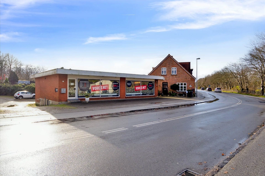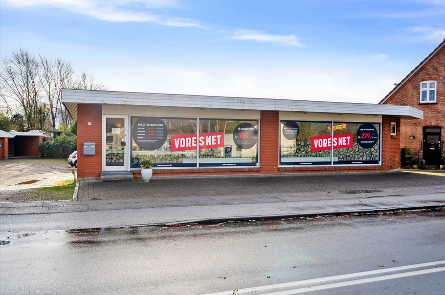 Erhvervsdelen har senest været anvendt til kontor og butik af antenneforeningen ”Vores Net”, fremtræder i en pæn og ordentlig stand – og synes oplagt til mindre butiks- eller servicevirksomhed, en frisørsalon e.l. Der er således en rigtig god synlighed i forhold til Hjertingvej, og desuden gode skiltningsmuligheder på den ca. 14 meter brede facade, ligesom det er nemt at parkere ved ejendommen – både foran og bagtil.