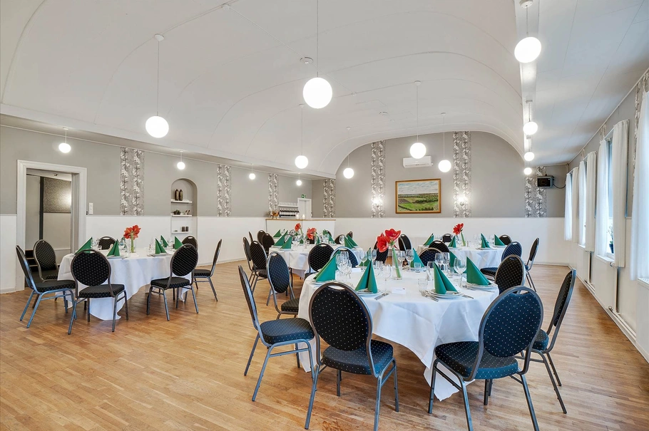 Såvel inde som ude fremstår ejendommen i en god og ordentlig stand, løbende vedligeholdt og moderniseret gennem årene. Der er lagt vægt på en lys og hyggelig indretning, som især er fremtrædende i den sydvestvendte restaurant og krostue med masser af lysindfald gennem de hvide dannebrogsvinduer.