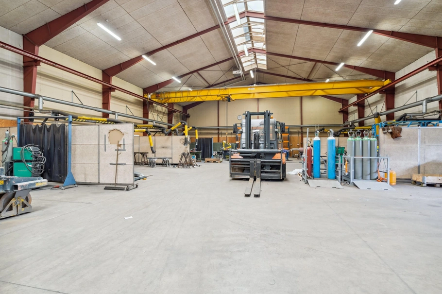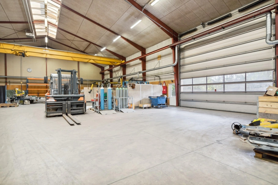 Hallen som vil være velegnet til produktion, værksted eller lager er opført i år 2000, med stålspær, isoleret og beklædt med plader, dermed er der et minimalt løbende vedligeholdelsesarbejde på bygningen. I tagrygningen er der ovenlysvinduer, som giver et rigtig godt lysindfald i hallen. I hallen er der en traverskran i fuld længde, med bæreevne på 3,2 tons. I forlængelse af lageret er ligeledes i år 2000 opført kontor og mandskabsrum med frokostrum, omklædning, toiletter og kontor. På den ene langside er der overdækning.