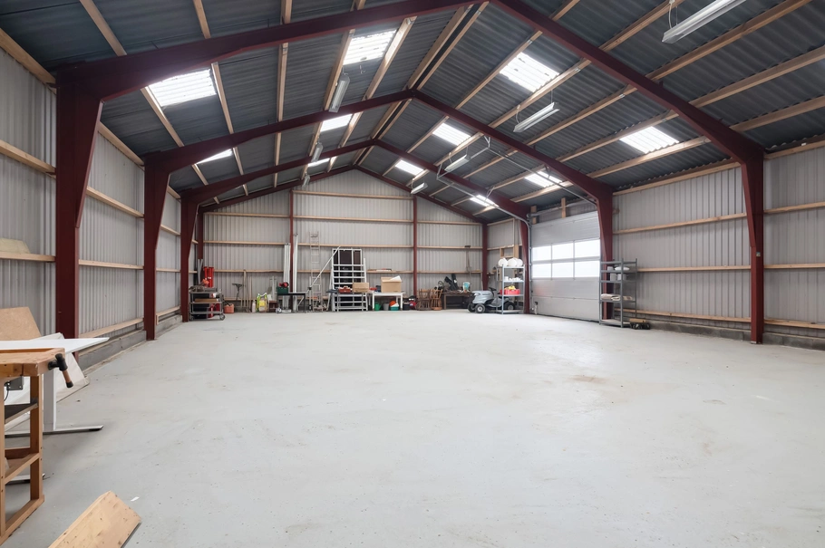 Maskinhallen / værkstedet er opført i stål med stålbeklædning, eternittag med ovenlys, indgangsdør, elektrisk hæveport, betongulv, stor lofthøjde og god belysning.