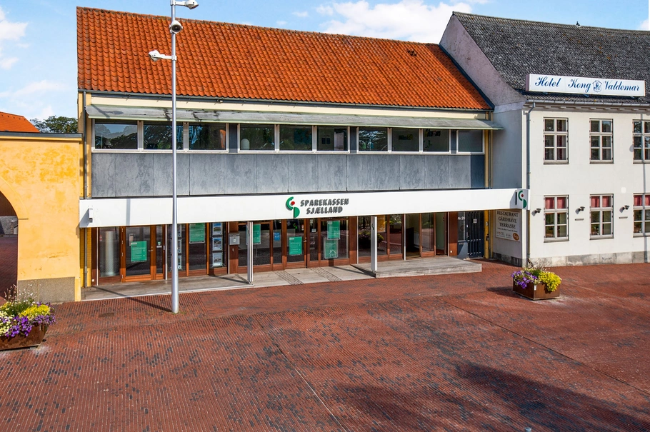 Yderst velbeliggende ejendom opført i 1963, men væsentligt ombygget i 2004, hvor lejemålet i stueplan ligeledes er istandsat. Ejendommen er opført i 3 plan kælder, stueplan og 1. sal. Stueplan har senest været benyttet til Sparekassen Sjælland, som har istandsat lejemålet, med nyere flotte plankegulve, der er etableret et lille café område centralt i lokalet. Lejemålet fremstår yderst præsentabelt, med et godt lysindfald fra de store facadevinduer.