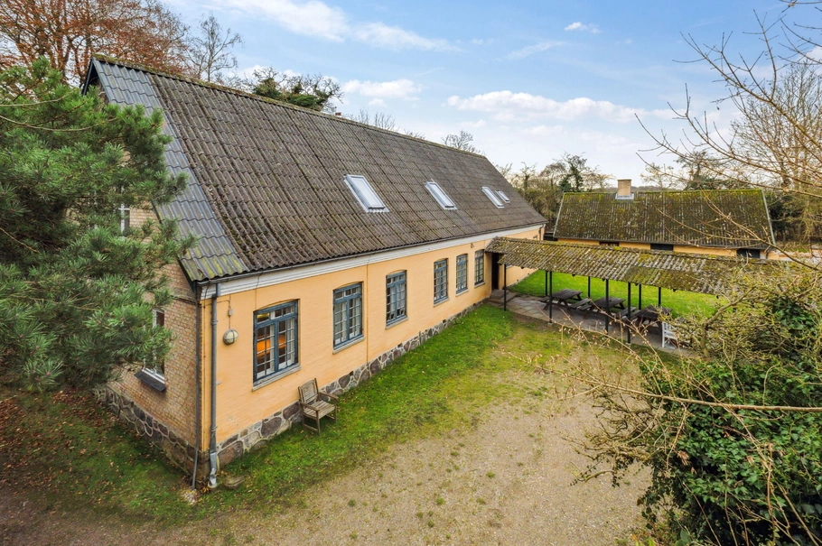 Ejendommen er indrettet som to selvstændige bygninger, der forbindes af en lang overdækket terrasse. Dette giver en unik kombination af privatliv og fællesskab - perfekt til at understøtte forskellige behov og funktioner.