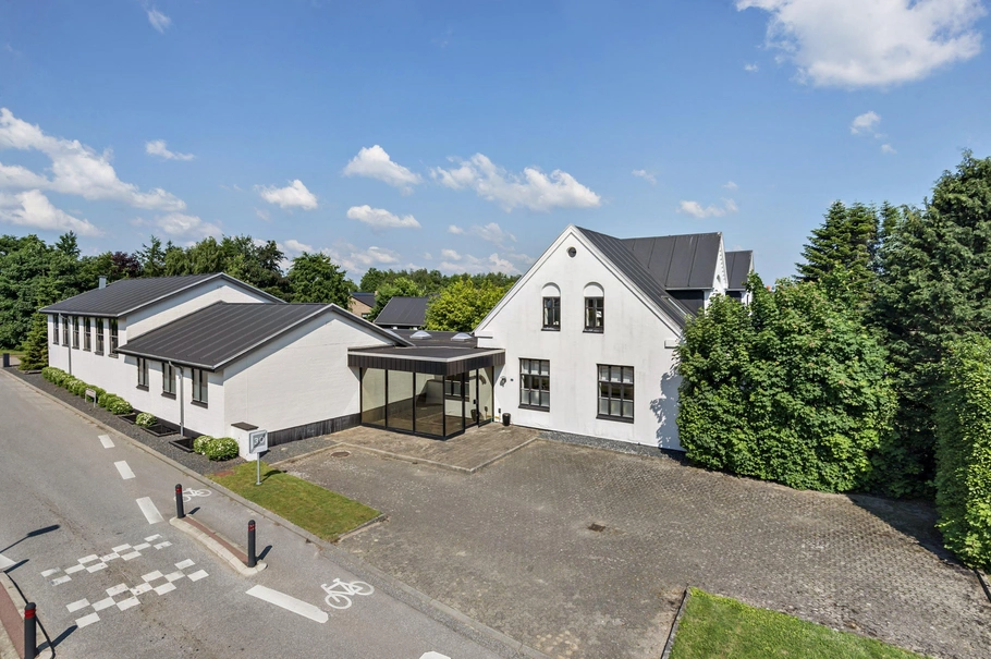 På den 4.422 m² store grund får du en lækker sydvendt lukket have med store træer, der giver god læ for vinden. I den nordlige ende af grunden finder du gode parkeringsforhold og en indre lukket gårdhave. Indvendigt byder de 449 m² bolig på en enestående atmosfære med god lofthøjde og på 1.salen får man synlige spær og hanebånd i alle opholdsrum. Sikke en velkomst man kan give sine kunder eller gæster i den store hall med den flotte trappe, udgangen til have og den tilstødende pejsestue. Skønt køkken/alrum, med hvidt inventar og flotte plankegulve. Her er der plads til hele familien, kombineret med virksomhed og pladskrævende hobbies. Erhvervsdelen, med direkte adgang fra beboelsen er moderniseret i samme stil og stand. Arealet er på 447 m² og rummer adkomstafdeling, stort åbent kontor, vinkælder i den tidligere bankboks, 2 toiletter, butiksafsnit, kontor, 2 lagerrum/kontorer samt den tidligere gymnastiksal, der i dag fungerer som studie/atelier. Derudover er der et allerede eksisterende "bed & breakfast" lejlighed med stort flot badeværelse med kar, disponibelt rum, stort værelse med tekøkken. Der er foretaget gennemgribende renoveringer både ud-/ og indvendigt i hele ejendommen med respekt for ejendommens oprindelse. Alle tagflader er skiftet til tagpap med listetækning. Badeværelser, køkken, bryggers og baggang står med flotte hvidt inventar. Alle gulve er h.h.v. sorte klinker og plankegulve. Stor dobbelte garage med godt værksted.Ejendommen er beliggende i Snejbjerg på vejen mod Gødstrup Sygehus. Kort vej til Engbjergskolen samt gode indkøbsmuligheder. For pendlere nås mortovejsnettet inden for få minutter.En unik og historisk ejendom, til den store familie, som ønsker noget udover det sædvanlige.