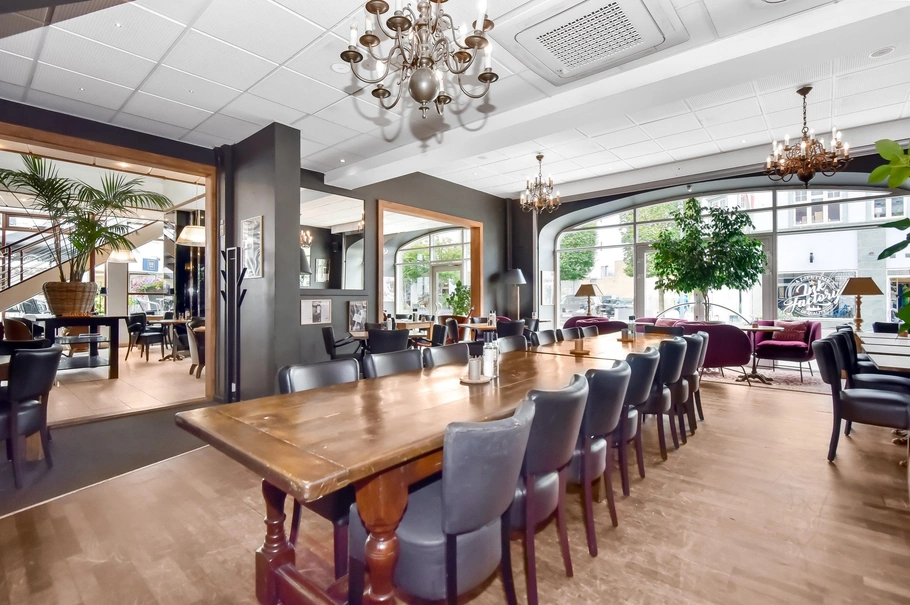 Bygningen er fordelt på fire etager, hvor de to første er indrettet som en café i to plan. Her får man i alt 590 kvadratmeter til rådighed, der kun venter på at blive fyldt med hyggelige stunder, god mad og et godt fællesskab. Cafépladsen strækker sig over stueetagen og første sal, begge med store vinduespartier, der sikrer et væld af lysindfald og skaber en indbydende og livlig atmosfære.