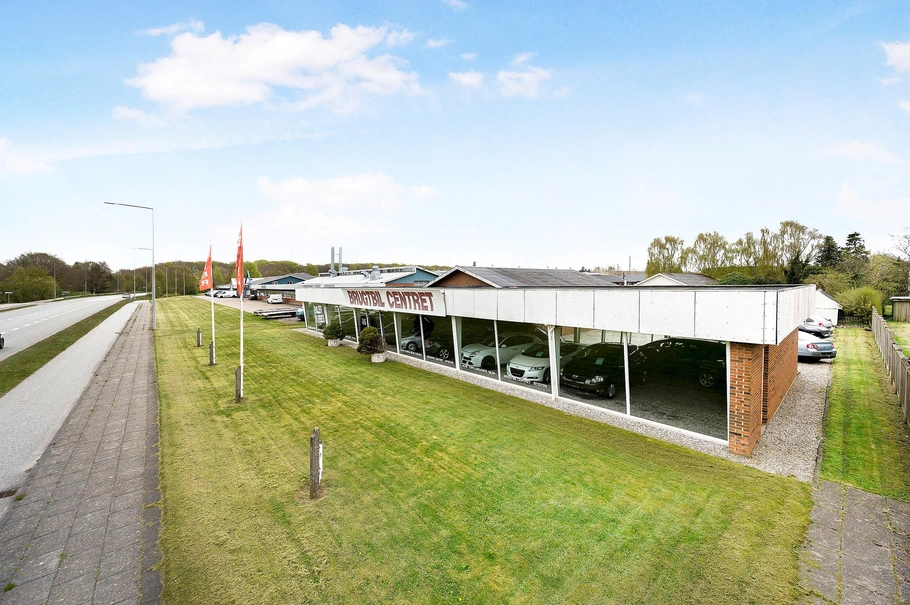 Erhvervsdelen er indrettet med et tilhørende salgskontor på ca. 23 m², fordelingsgang mellem butikslokale og værksted, depotrum, toilet samt et ekstra dispositionsrum i tilknytning til værkstedet. Værkstedet er på ca. 200 m² og indrettet 2 stk. lifte, olieudskiller samt indskudt dæk, der p.t. anvendes til dækopbevaring.