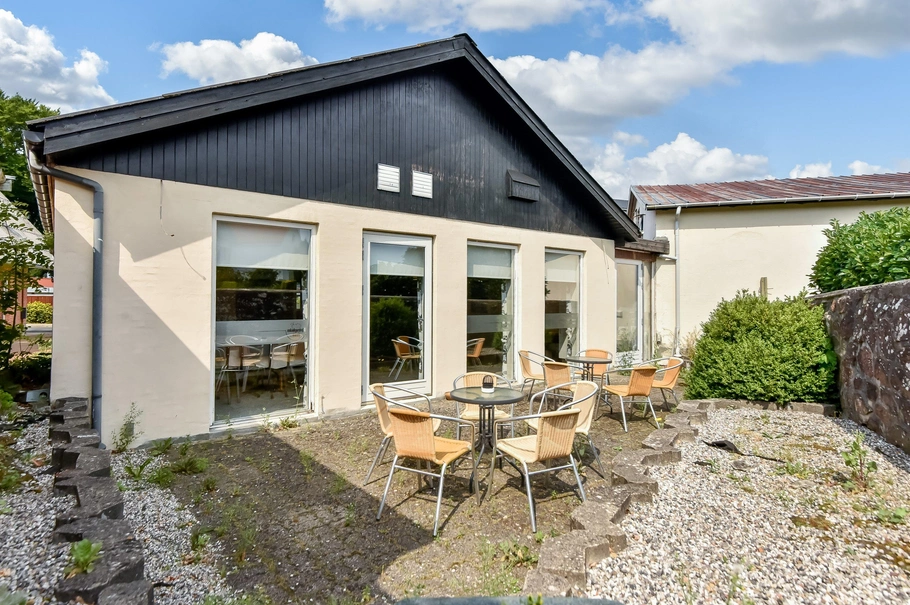 I tilknytning til mellemgangen mellem de to sale, er der oprettet et hyggeligt flisebelagt udeområde til gæsterne, hvor snakken kan gå og vejret kan nydes. Gæsterne til de større arrangementer bydes naturligvis velkommen til Ejstrupholm Hotel - via den røde løber - der er