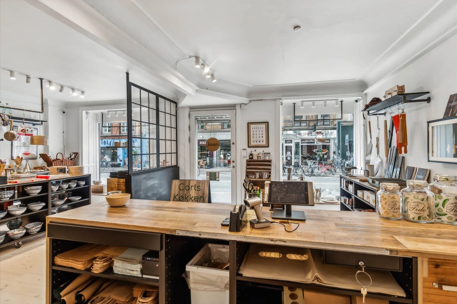Butikkens 93 m² indeholder stort og meget regulært butikslokale i en vinkel, baglokale/lager, lille baglokale med tekøkken samt et toilet. Endvidere 50 m² virkelig god kælder til lager med nedgang i butikkens forlokale via lem.