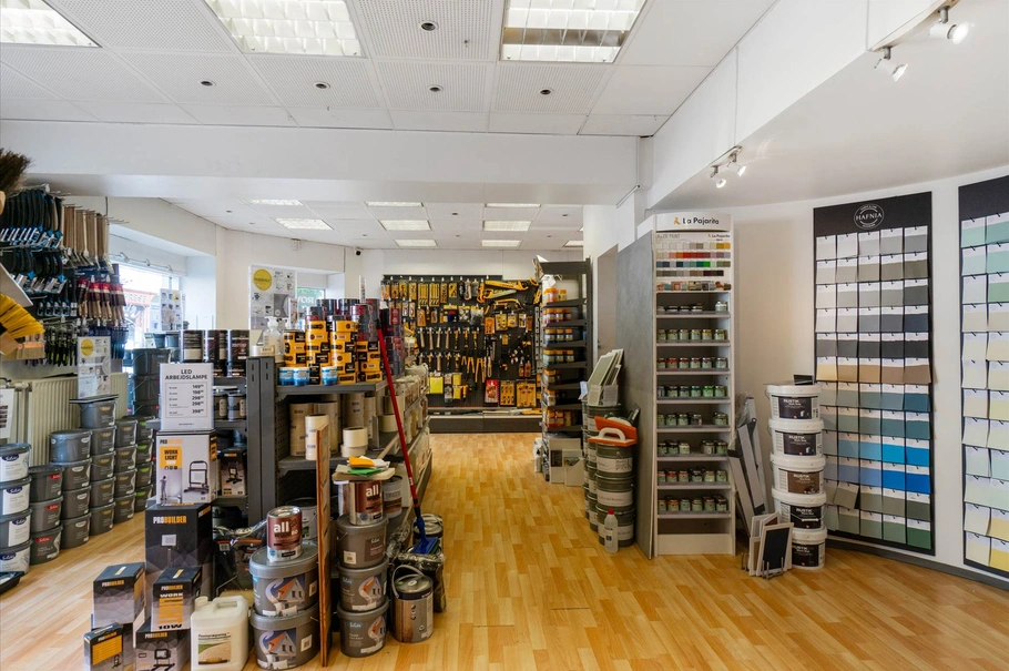 Salgsareal i et stort vinkellokale samt yderligere et stort rum. Endvidere fint baglokale.