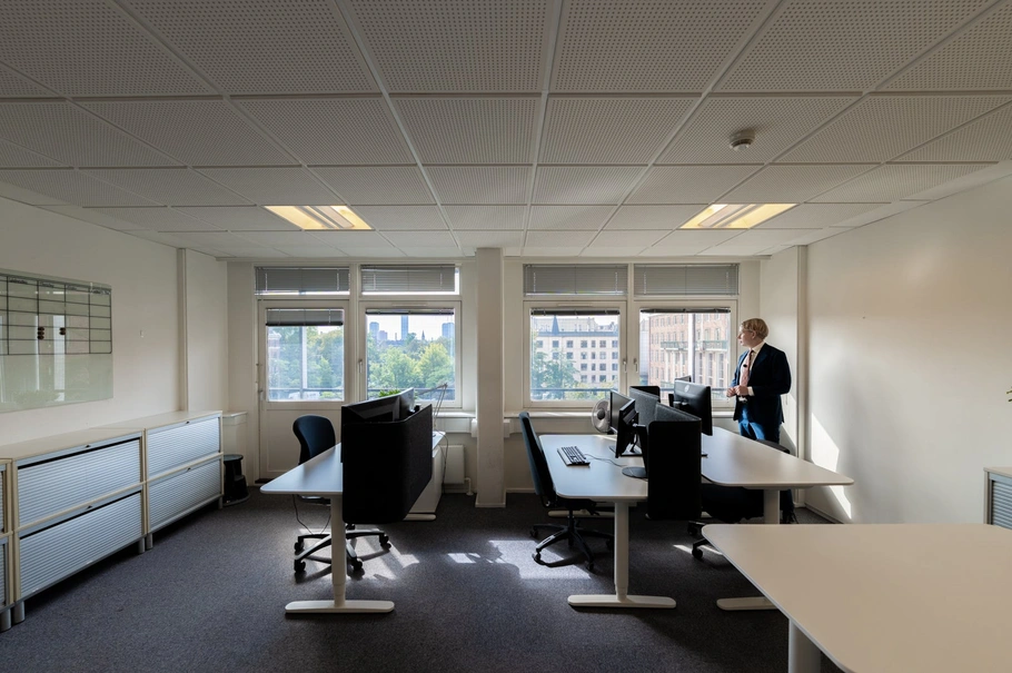 både cellekontorer, fællesområder og mødelokaler.