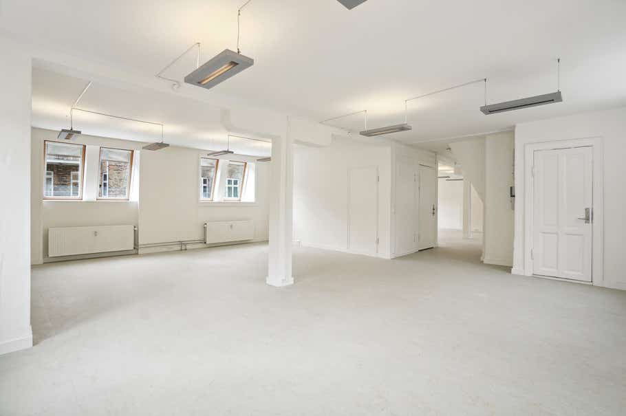 Indeholder: Entre/ fordelingsgang til 2 store storrumskontorer, som nemt kan indrettes til flere kontorer eller klinik. Det ene rum har franske døre ud mod gårdmiljøet. Endvidere nyt pænt toilet, samt nyt hvidt te-køkken.
