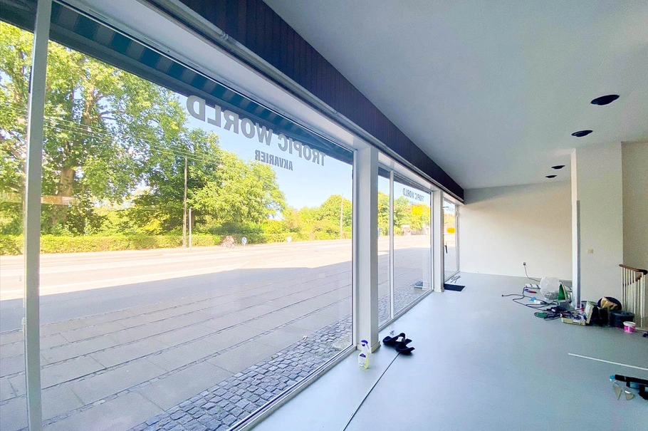 Store butiksvinduer og indgang med glas