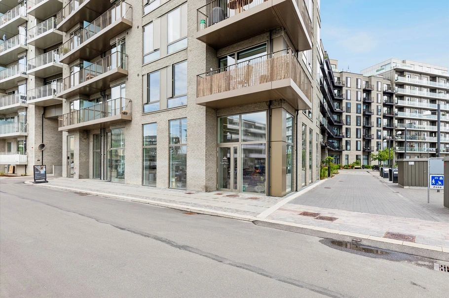 Der er to indgangspartier til lejemålet fra George Marshalls Vej og store facadevinduer på begge sider af hjørnet, som sikrer et flot lysindfald i lokalerne.