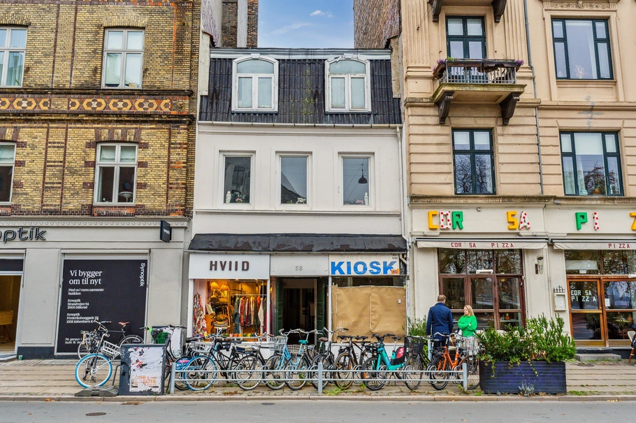 Østerbrogade 58 er en lille charmerende hvidmalet 3-etagers ejendom beliggende lige for enden af Sortedams Sø. I ejendommens stueetage ligger to små butikslejemål, hhv. Hviid Design og senest en kiosk, som nu er fraflyttet. Vi genudlejer kiosk-lokalerne til ny anvendelse, og overtagelse primo 2025.