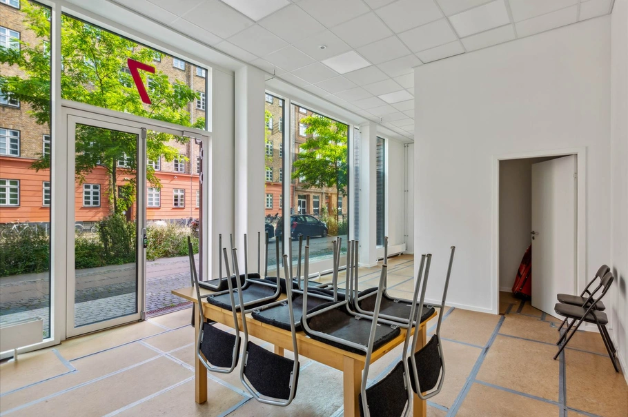 Indeholder salgslokale med udstillingsvindue ud mod gaden, toilet samt lille lagerrum (der kan evt. opsættes lille køkken, hvis det skal gemmes væk).