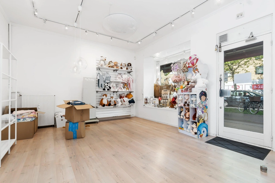 Lejemålet fremstår flot og velholdt og har en fantastisk rumfordeling. Når I træder ind ad døren, er der et stort salgsareal, hvor der er højt til loftet og et fantastisk lysindfald fra de store facadevinduer ud mod Amagerbrogade.