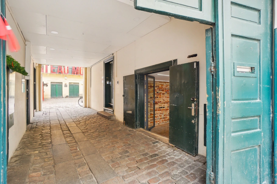 Indgangen er placeret i porten og fremstår indbydende med god loftshøjde og charme fra de rustikke materialer.