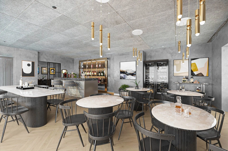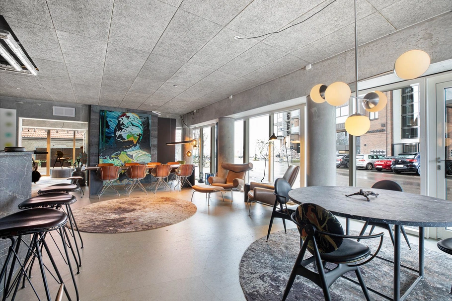 I bliver mødt af en imponerende loftshøjde og rå betonelementer, samt brede vinduer, der skaber en flydende overgang mellem inde og ude. De mange lækre kvadratmeter fordeler sig på toiletfaciliteter, kontor og tre store lokaler, hvoraf det ene er indrettet med et lækkert køkken i træ med indbyggede vinkøleskabe. Der er en fleksibel planløsning, og med tre indgangspartier kan der nemt indrettes tre separate lokaler til tre forskellige firmaer.