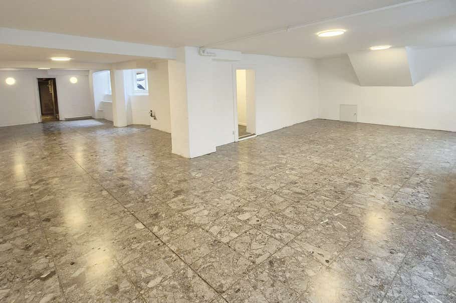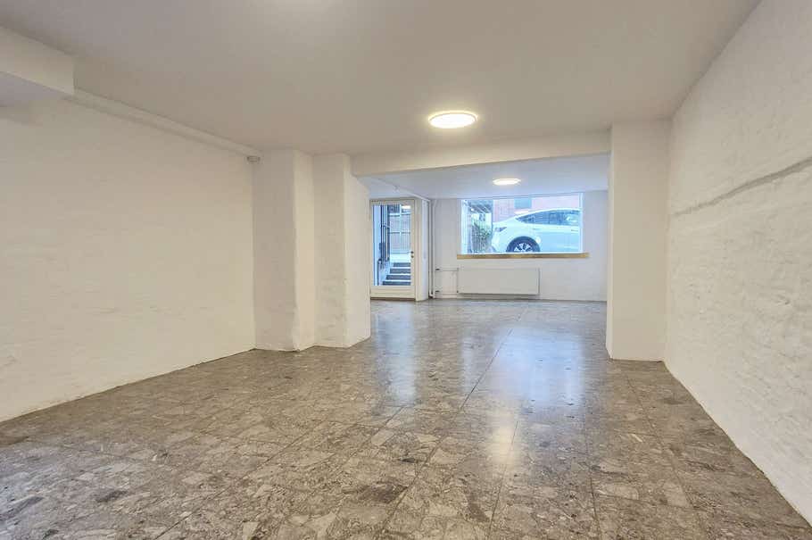 Lejemålet er primært indrettet med ét stort åbent rum og indeholder derudover 2 kundetoiletter, baglokale samt personaletoilet. Denne del udgør 170 m² og derudover indeholder lejemålet 40 m² lager/ teknik under porten, som tilgås enten via lem direkte fra lejemålet eller fra gården.