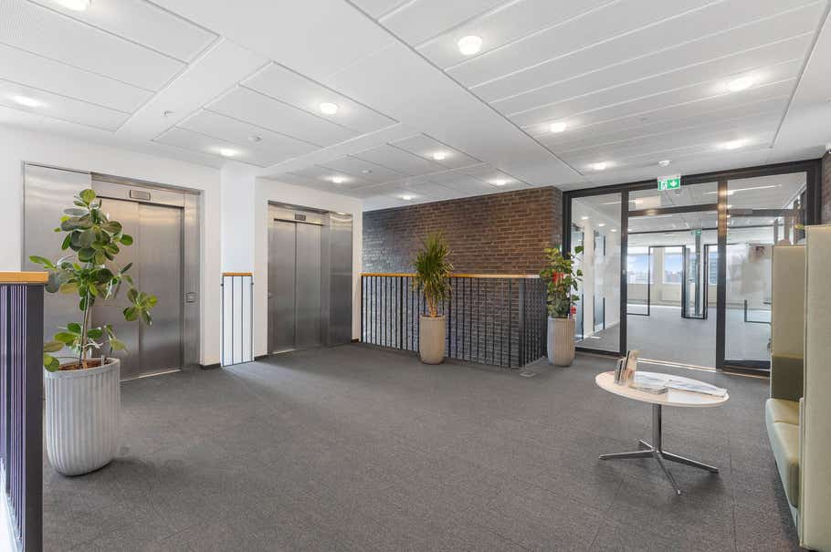 Ejendommen byder på et repræsentativt ankomstparti med elevator, der leder op til et flot møbleret loungeområde, som skaber en imødekommende ramme for både medarbejdere og gæster.