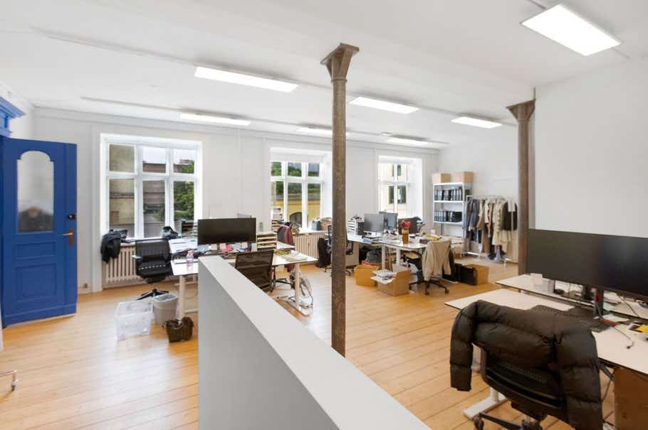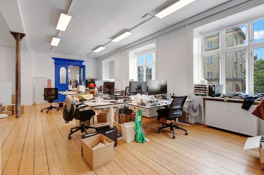 Kontor/showroom med højt til loftet og plankegulve i kreativ