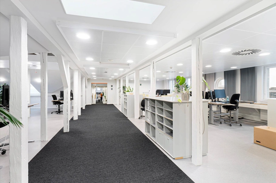 Lejemålet indeholder flotte storrumskontorer, mindre mødelokaler/kontorer, pæne toiletter, et par kaffestationer, ligesom der indrettes frokoststue/kantine i samråd med lejer.