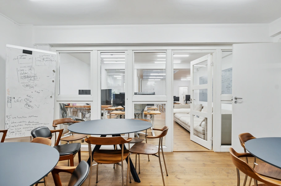 Til venstre fra entréen træder du ind i et storrumslokale, der har fritlagte bjælker og et stort nyt ovenlysvindue. Desuden et stort 5-fags dannebrogsvindue med kig til ejendommens gård. Gården er pæn og charmerende og benyttes bl.a. til cykelparkering. Ovenlysvinduet gør, at lokalet er super lyst og et meget behageligt opholdsrum. Storrummet fortsætter videre bagud i lejemålet, med en enkelt søjle til opdeling. Bagerst er der 3 stk. vinduer med udsigt til den flotte grønne gård bag ejendommen. Desuden et funktionelt godt køkken, toilet, arkivplads og bagtrapper.