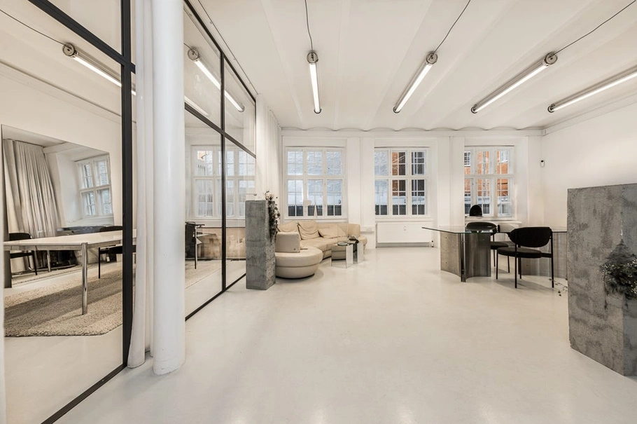 101 m² kontor/ showroom med hint af New Yorker stil. Lejemålet har helt eget indgangsparti med adgang fra gården. Lejemålet består af et stort åbent rum som er oplagt til kontor med plads til ca. 6 arbejdsladser eller showroom. Herudover er der et stort mødelokale.